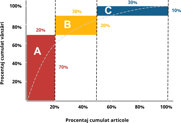 - Categoria C: articole sau clienți cu valoare redusă, dar care necesită gestionare eficientă pentru a nu consuma resurse disproporționate.